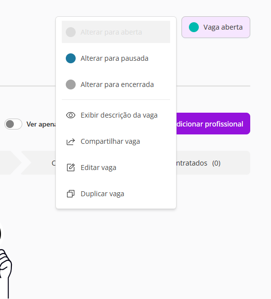 No canto superior direito, você poderá alterar o status da vaga: