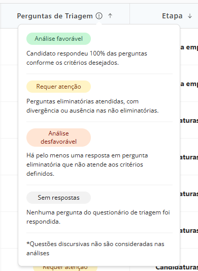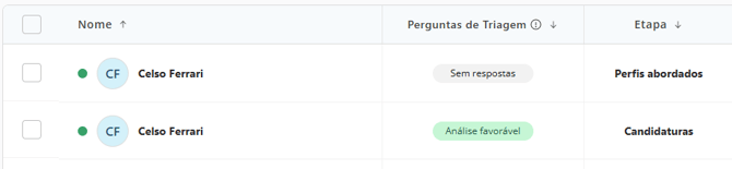 É possível visualizar, na lista de candidatos da vaga, o desempenho obtido nas perguntas de triagem:
