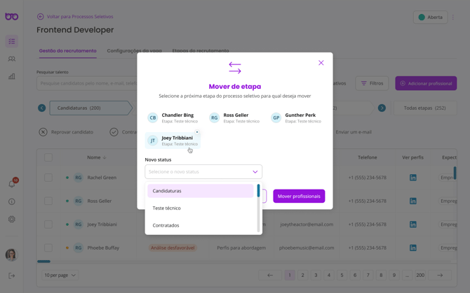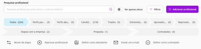 Nesta página você poderá gerenciar os candidatos à vaga. Selecionando um ou mais candidatos, as seguintes opções irão aparecer abaixo das etapas de recrutamento: