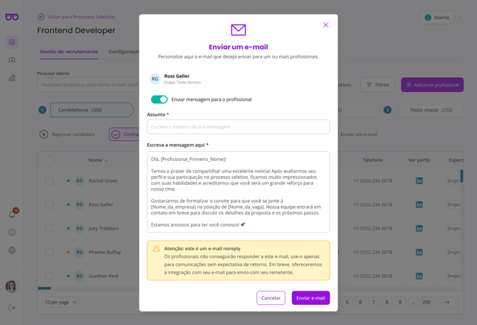 É possível enviar e-mails para um ou mais candidatos selecionados diretamente pela plataforma.