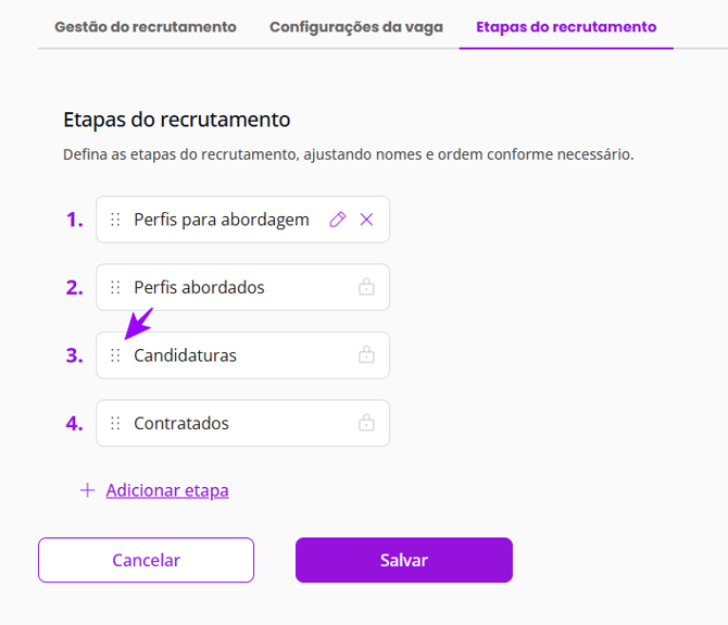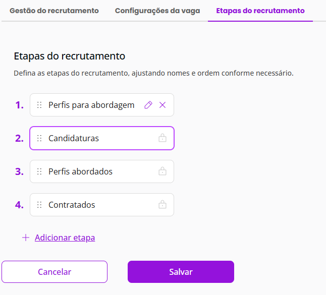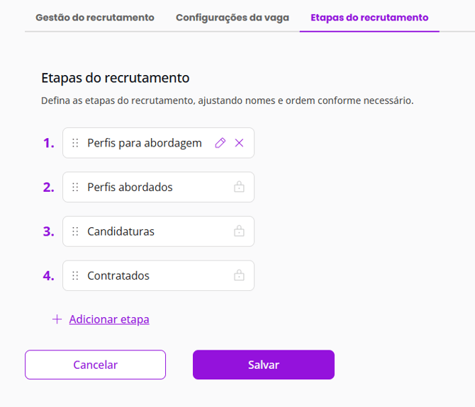 As etapas “Perfis abordados”, “Candidaturas” e “Contratados” não podem ser removidas, pois são fundamentais para o acompanhamento e gerenciamento do processo seletivo.