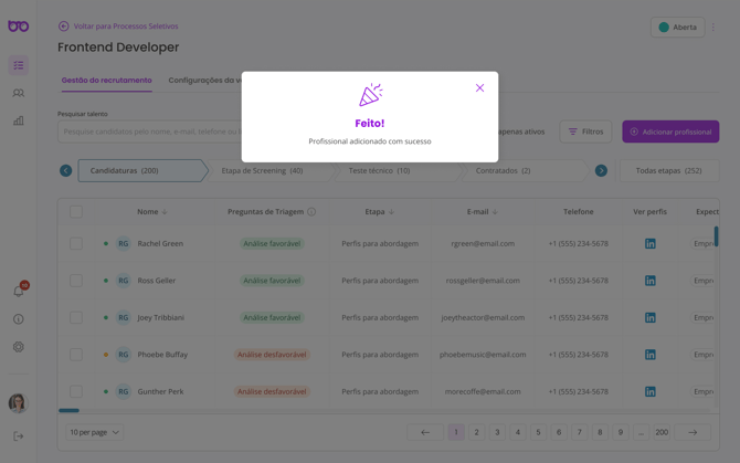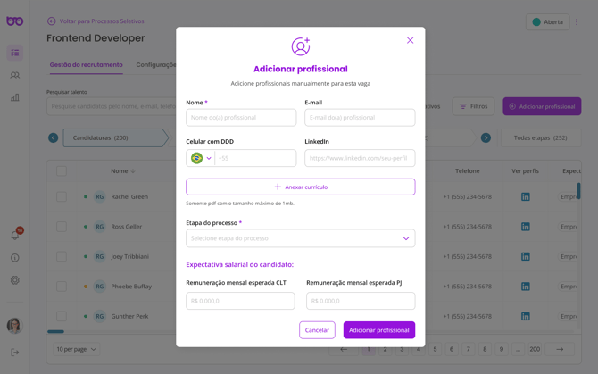 Ao clicar em adicionar profissional, você deverá preencher os dados do candidato para adicioná-lo ao processo de recrutamento, assim, é possível a adição de profissionais fora do pool de candidatos.
