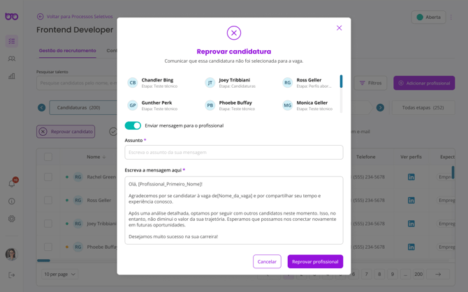 Selecione um ou mais candidatos que deseja reprovar no processo seletivo, clique na opção de Reprovar Profissional e preencha os campos: