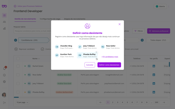 Selecione um ou mais profissionais que deseja definir como desistente do processo seletivo, clique na opção “definir como desistente”, confira se está de acordo e confirme a ação: