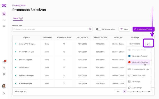 Após criar uma vaga, você pode gerenciá-la e realizar alterações sempre que necessário.